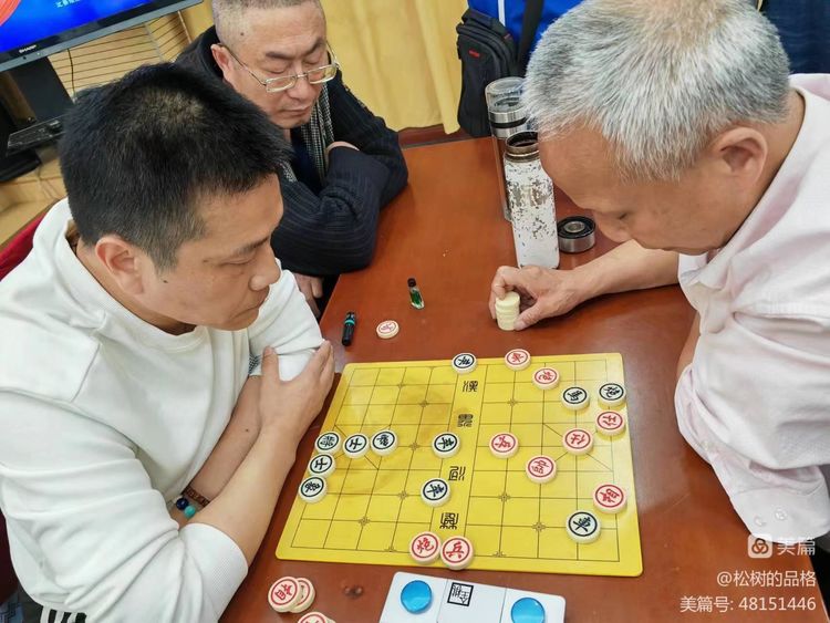 获得本赛第三名的是同济大学王新福老师。王老师现已年近古稀,但依然精神饱满。他一生有两大爱好,一是喝酒,二是象棋。早年他曾是全国高校教职工象棋冠军的获得者。前一阶段,他喝酒伤神致使比赛成绩急剧下降,开始逐渐淡出人们的视野。现在他又重新出山,并以不败战绩一举获得季军。他的中炮进七兵双正马的布局炉火纯青。图为:上海铁路局老冠军张华安、江苏丹阳市象棋协会会长洪流、王新福和大场象棋协会秘书长胡民权在比赛中。